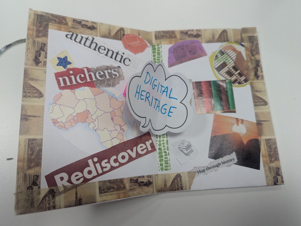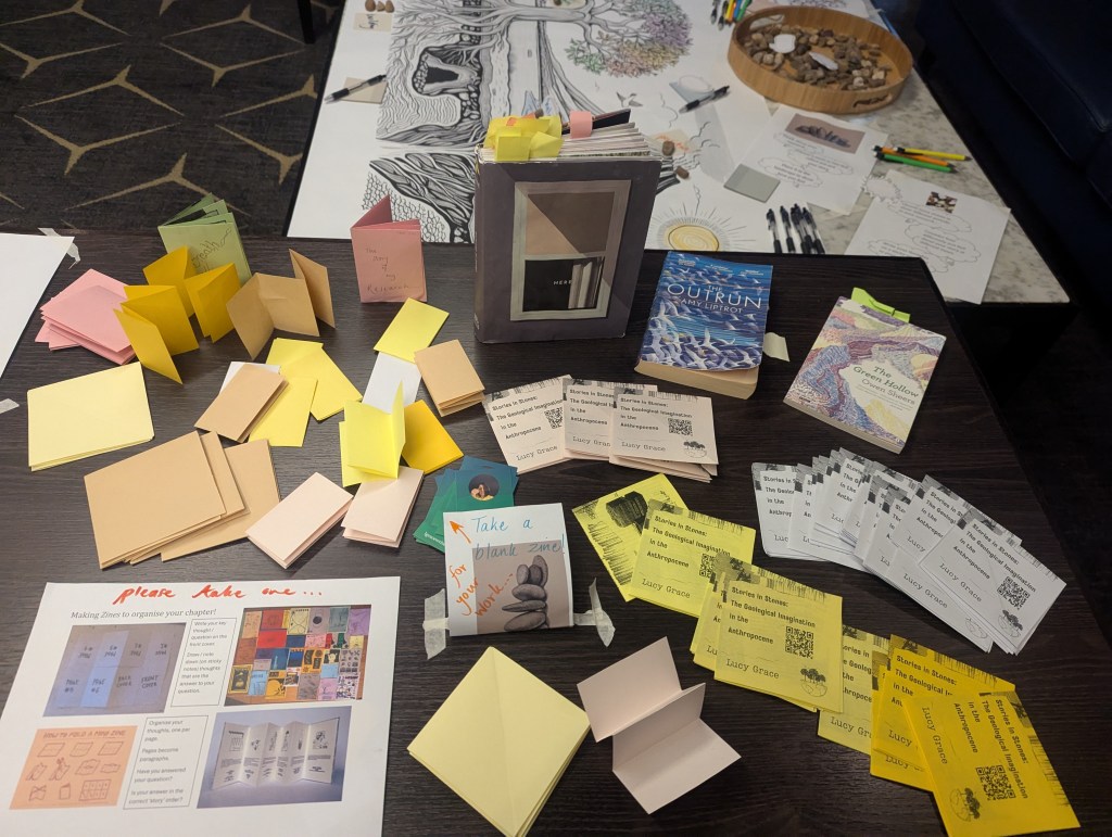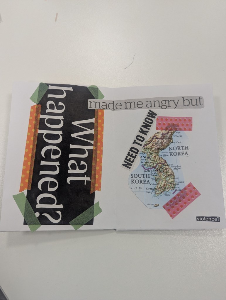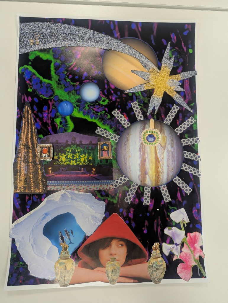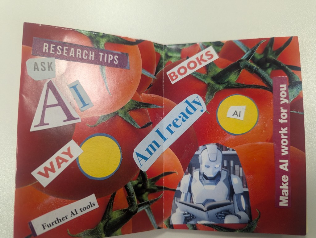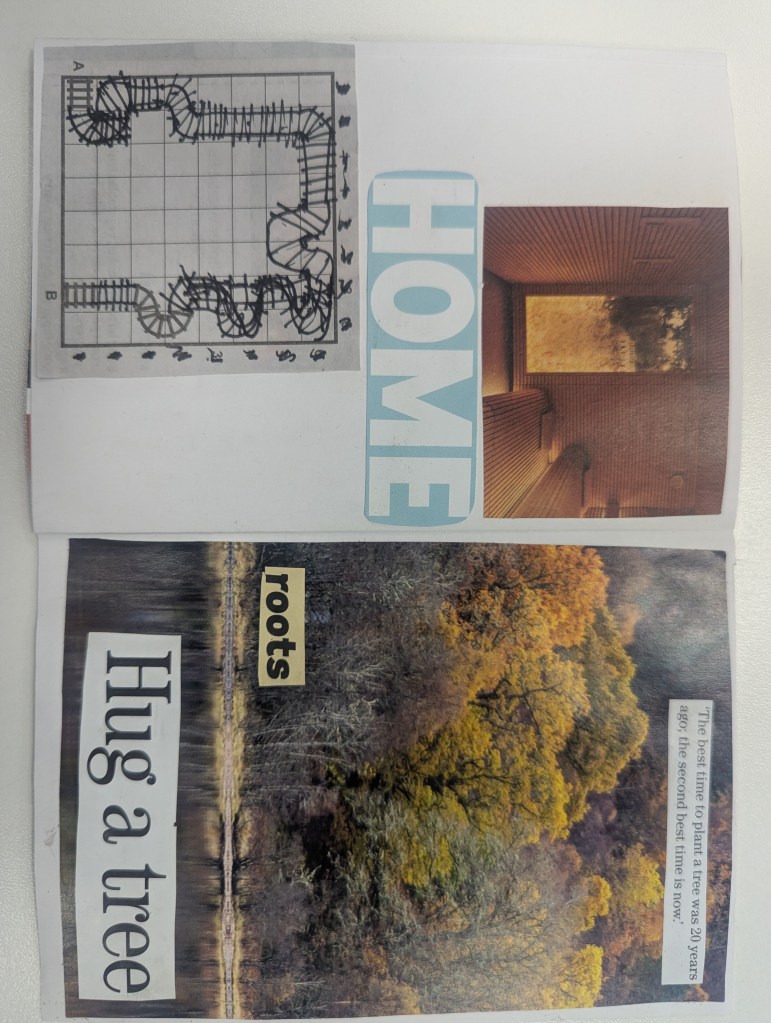 I hold workshops for writers, readers and researchers to collage and create a Zine of their own about any topic they choose. These images are from PhD researchers at Nottingham Trent University, October 2025.